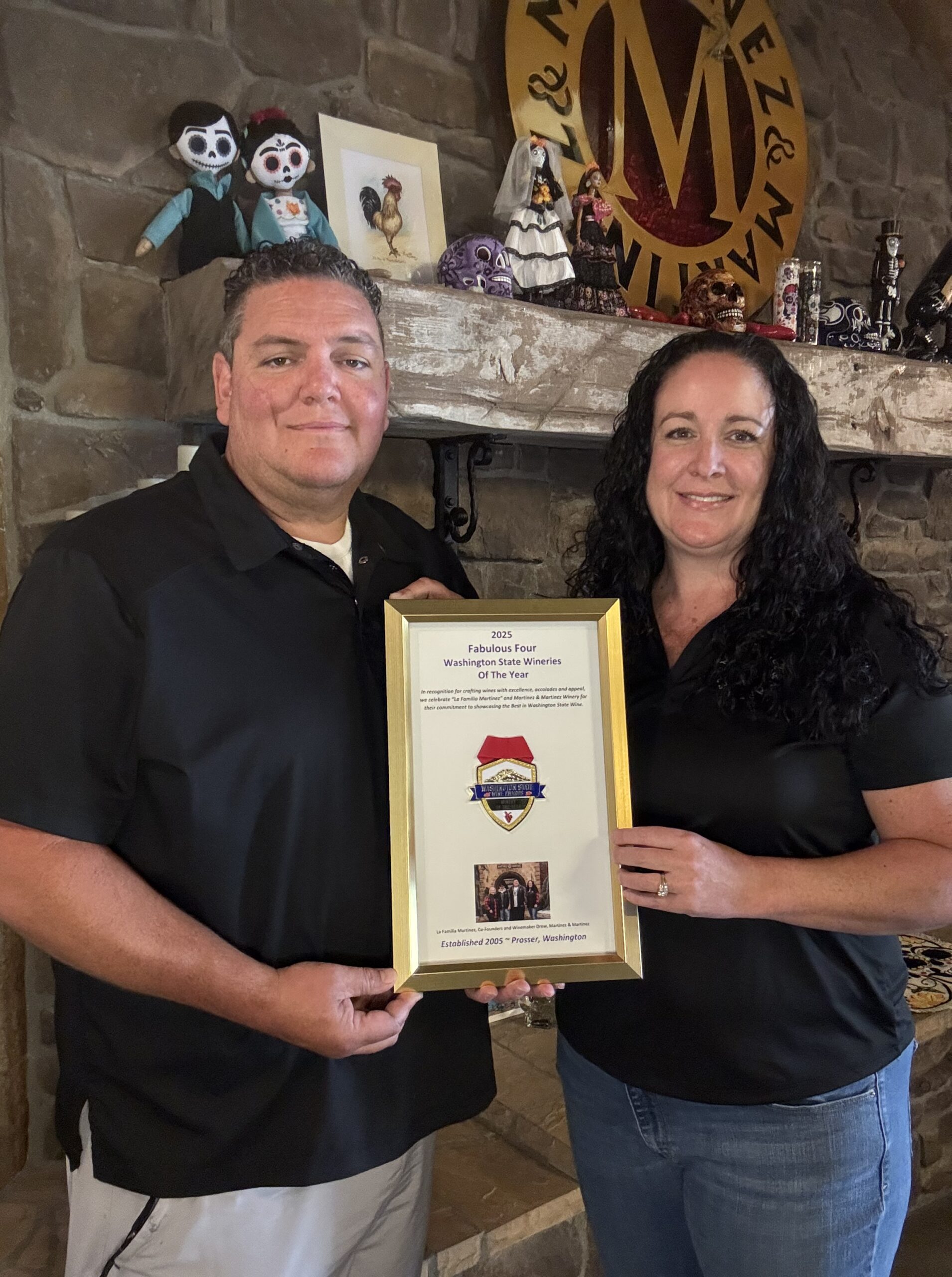 The Martinez family owns a small vineyard of Cabernet Sauvignon they planted in 1981 on the Horse Heaven Hills AVA (HHH’s) and are a small family owned and operated vineyard and winery. They take pride in the family’s Latino heritage as the vineyard owner, Sergio Martinez; is from Mexico while his wife Kristy is 3rd generation Prosser resident. Their son Drew Martinez is the winemaker and his wife Monica the General Manager. Customers will find numerous artworks inside the winery representing the Latino heritage including Dia de Los Muertos art.